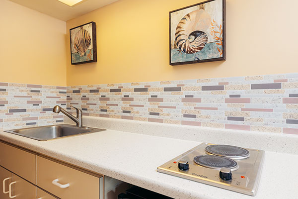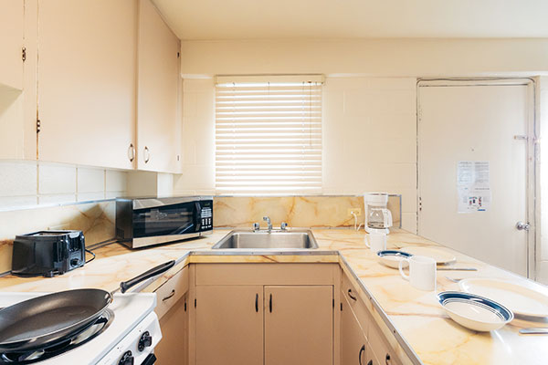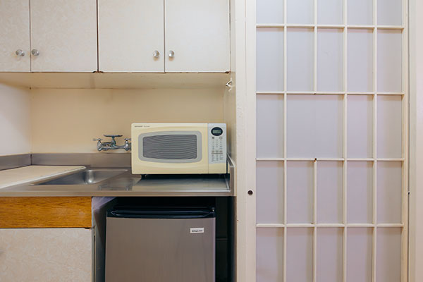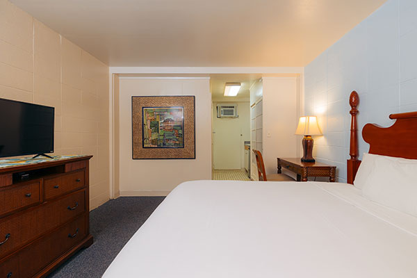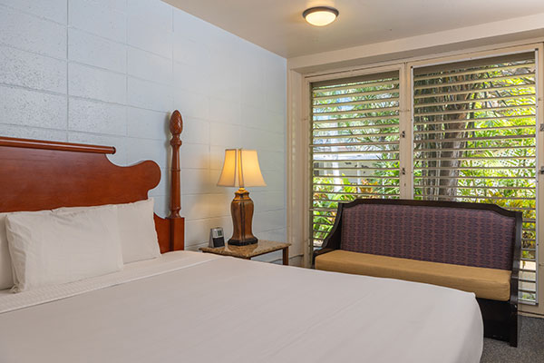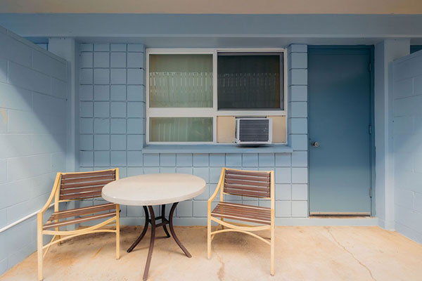 キチネットが付いたスタジオタイプのお部屋です。プライベートラナイ(バルコニー)がついており、プールのあるコートヤードを見渡します。カップルでのご利用に最適です。