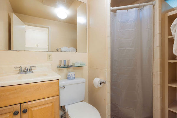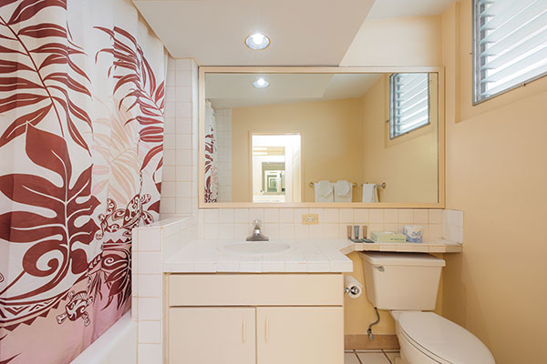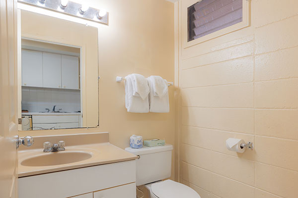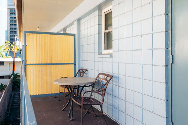 この部屋には、プライベートラナイ(バルコニー)、キチネット、洗濯機&乾燥機が備わっています。バルコニーからは太平洋を見渡します。お部屋では高速Wi-Fiをご利用いただけます。