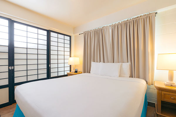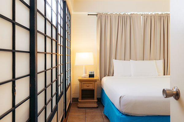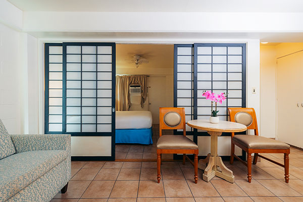 最大6名ご宿泊いただけるスイートルームです。プライベートラナイ(バルコニー)からはフォートデルッシ公園を見渡します。お部屋にはフルキッチン、洗濯機&乾燥機が備わり、高速Wi-Fiをご利用いただけます。グループでのご利用におすすめです。