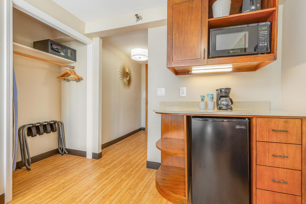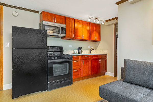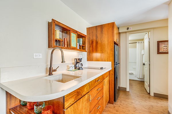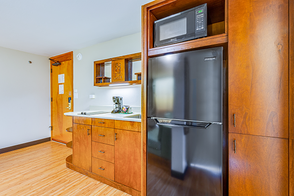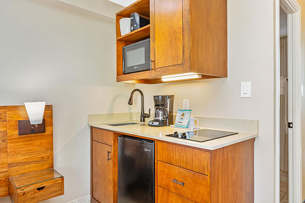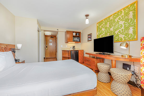 広々とした快適なスタジオで、各客室には簡易キッチン、ラナイが付いています。