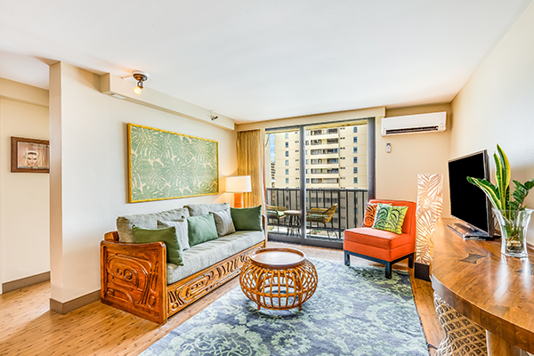 カップルや少人数のご家族に人気の広々としたスイートで、ラナイ、ベッドルーム1室、独立したリビングエリア、簡易キッチンのある客室です。