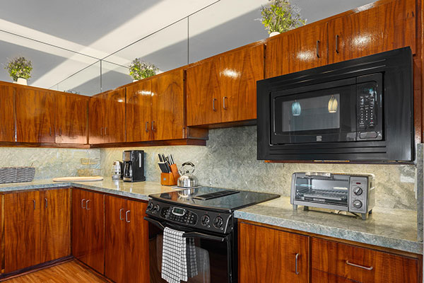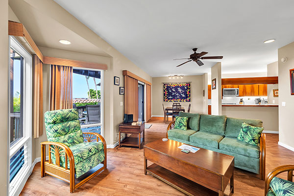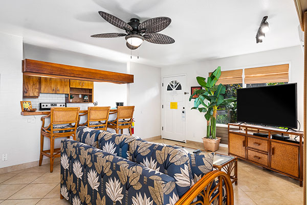食洗機のあるフルサイズのキッチン、プライベート ラナイ、高速インターネット、シーリング ファン、ケーブルテレビを備えている、1ベッドルームのお部屋です。ベッドの種類は、ソファベッドとキングサイズまたはクイーンサイズとなります。
