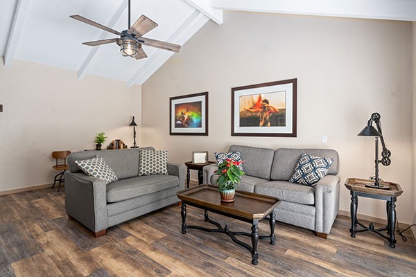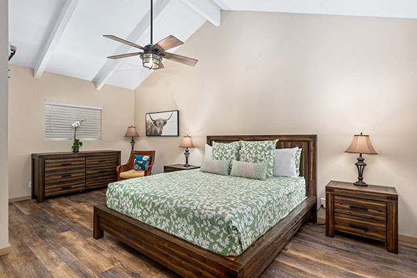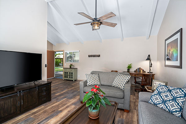 広々とした65.0㎡のスイートで、高い天井にはシーリング ファンがあり、ハワイ島の上質な写真が飾られた客室となります。